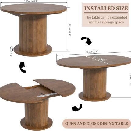 43.3 inch 59 inch Adjustable Size Round Dining Table for 4 6, Unique Design Modern Farmhouse Kitchen Table, Circle Dining Tables with Wood Strip Base for Kitchen Living Room (Walnut)