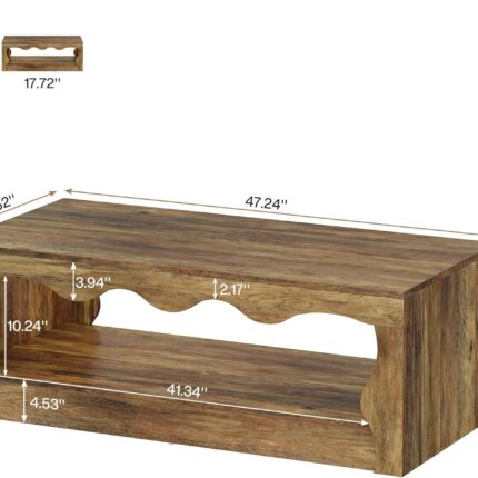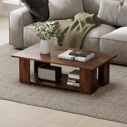 Rectangle Coffee Table, 47-Inch Farmhouse Coffee Tables for Living Room, 2-Tier Wooden Rectangular Accent Center Low Cocktail Tea Table with Open Storage Shelf, Rustic Brown