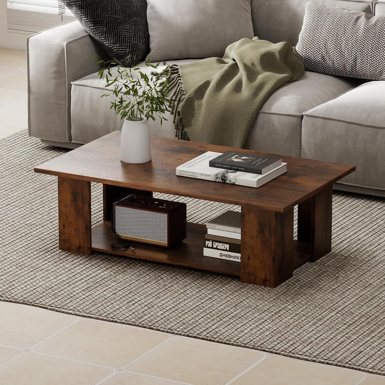 Rectangle Wood Center Table, 41″ L 2-Tier Large Modern Tea Table w/Open Compartment, Easy Assembly, Accent Coffee Table for Living Room, Reception Room, Rustic Brown