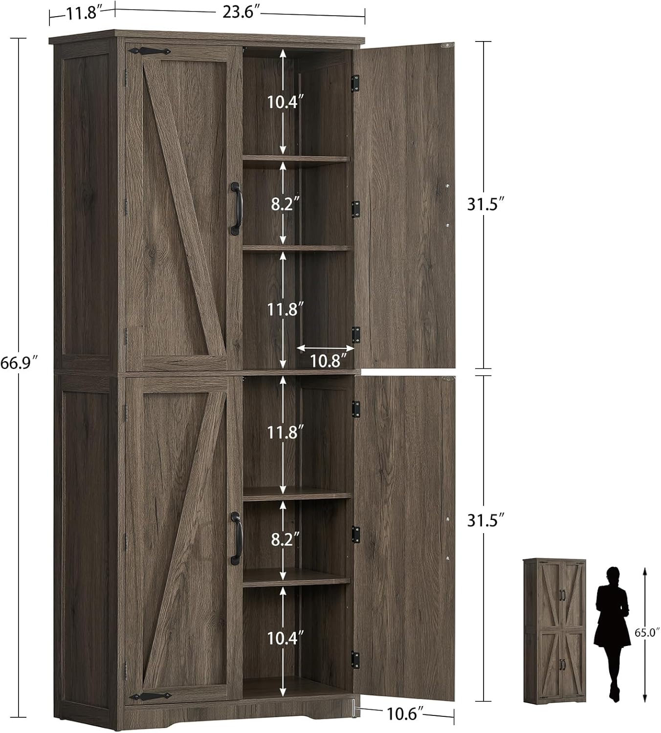 Tall Storage Cabinet, Kitchen Pantry Cabinet with 4 Shelves, Adjustable Shelves, Pantry Cabinets with 4 Barn Doors, Tall Kitchen Cabinets for Dining Room, Living Room, Dark Walnut
