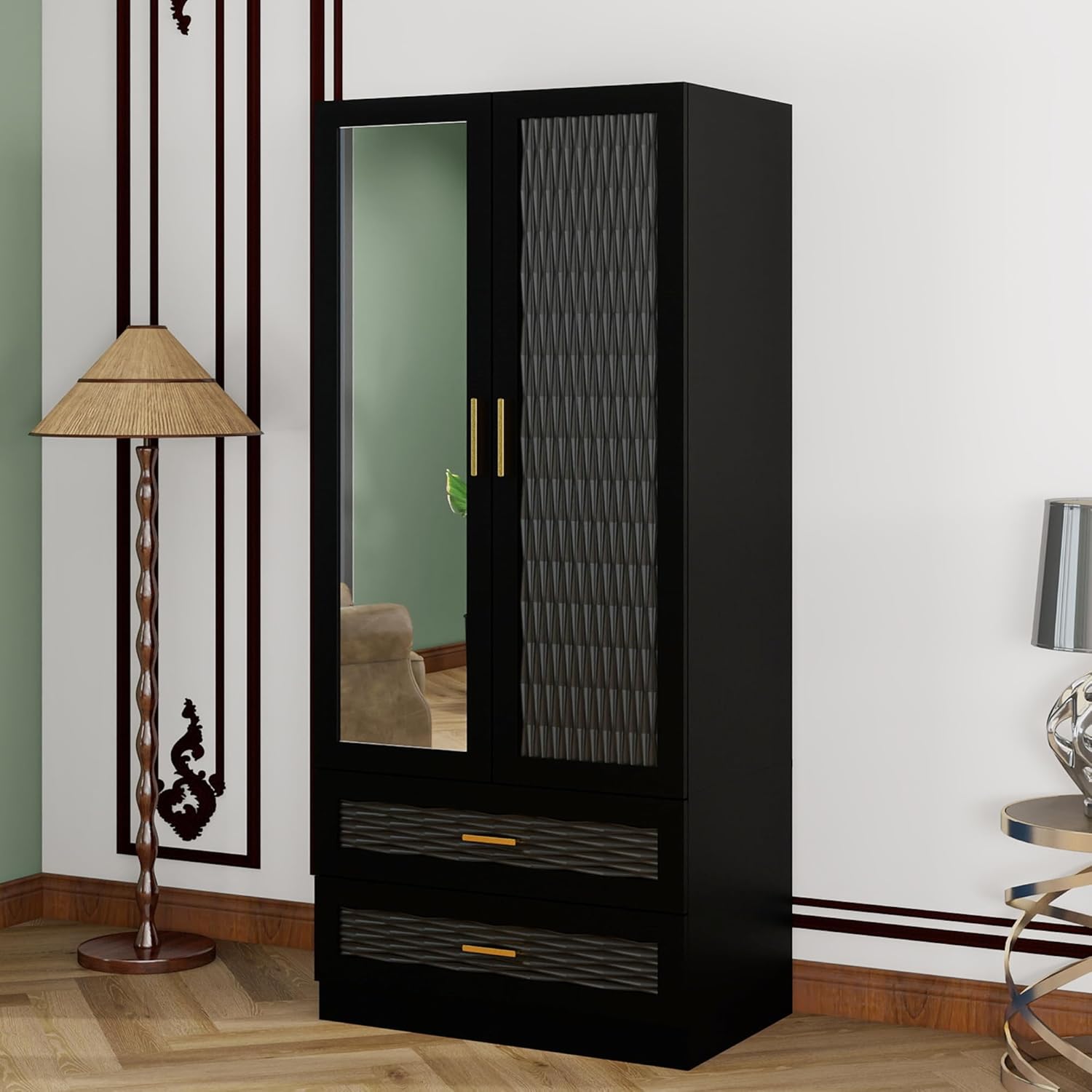 - Classic & Elegance – The exquisite woven pattern door with half-length mirror design enriches this large armoire wardrobe closet, infusing your home with sophistication and style. Designed with clean lines and a streamlined silhouette, this armoires and wardrobes effortlessly integrates into various themes rooms.
