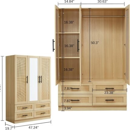Rattan Wardrobe Closet with Mirror: 3 Door Bedroom Armoires Wardrobe Closet with 4 Drawers Tall Wardrobe Closet Cabinet with Shelves