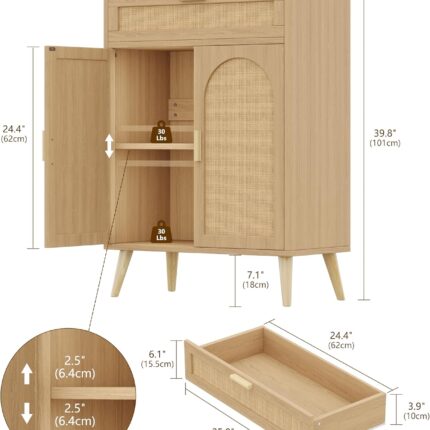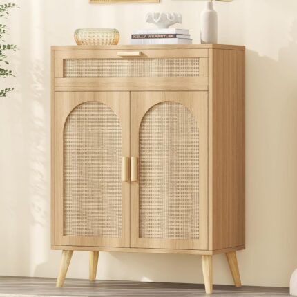 Rattan Buffet Cabinet with Storage, Sideboard with Drawer & Adjustable Shelf, Accent Kitchen Floor Storage Cabinet with 2 Doors & Solid Wood Feet, Coffee Bar for Living Room, Entryway, Natural Oak